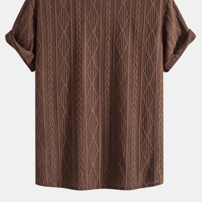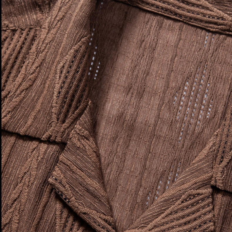Este conjunto para hombre combina frescura y estilo en un outfit moderno ideal para los días cálidos. Incluye una camisa blanca de manga corta con cierre frontal y un pantalón de corte amplio en tejido de lino y algodón, creando un look equilibrado entre lo casual y lo elegante. La camisa destaca por su patrón geométrico tipo calado (eyelet), que aporta textura y un toque distintivo, mientras que el pantalón ofrece comodidad y libertad de movimiento gracias a su corte relajado.